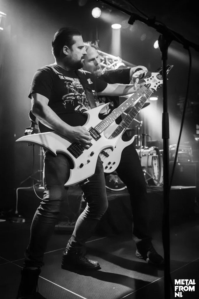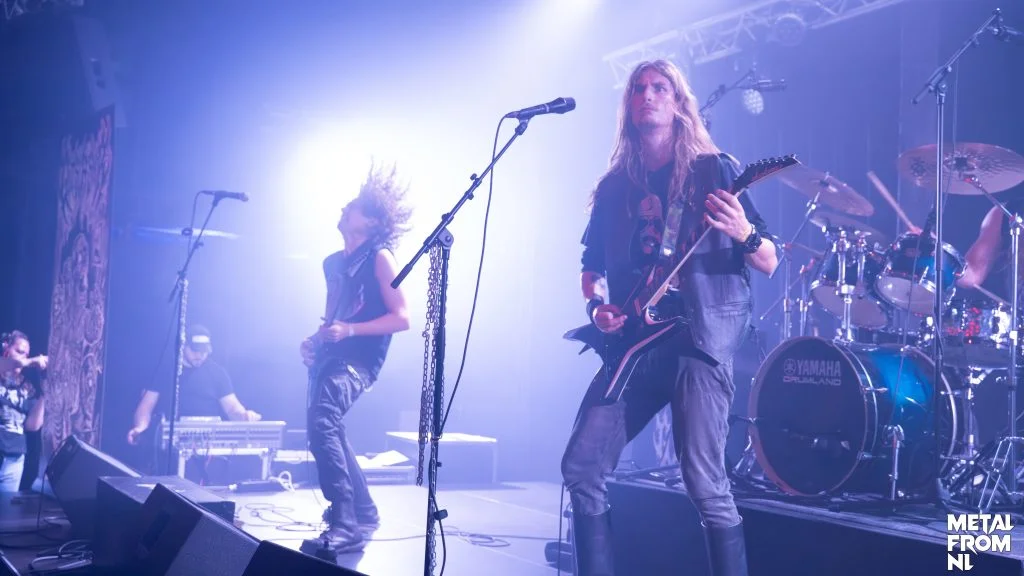 De eerste band van de avond is de band rondom gitarist Alex Mulder; Mutator. Deze band heeft net hun debuut plaat uit, en heeft sinds kort een nieuwe drummer. Met “Excessive Rage” in hun achterzak speelt de band vandaag vooral nieuwe nummers in hun half uur durende set. De band bestaat al wel wat langer, maar zoals nou eenmaal hoort in de scene - verschillende bandwisselingen maakten dat het nog even duurde voordat de plaat uitkwam, en ze eindelijk op het podium konden verschijnen bij NH Metalfest. De band heeft duidelijk nog wat meer live-ervaring nodig, want er ontstaan af en toe toch wat akward stiltes, met name tijdens het omstemmen voor het laatste nummer van de set. Ook de interactie met het publiek is iets waar nog aan gewerkt kan worden; na een onwennige opkomst, duurt het twee nummers voordat de frontman iets tegen ons zegt. Dat gezegd hebbende; aan gitaar solo's van Alex geen gebrek, al zijn het met name de melodische riffs van het oudere nummer Crystal Mountain waar ik vrolijk van wordt. Al zou het qua geluid geen kwaad kunnen om een tweede gitarist in dienst te nemen.